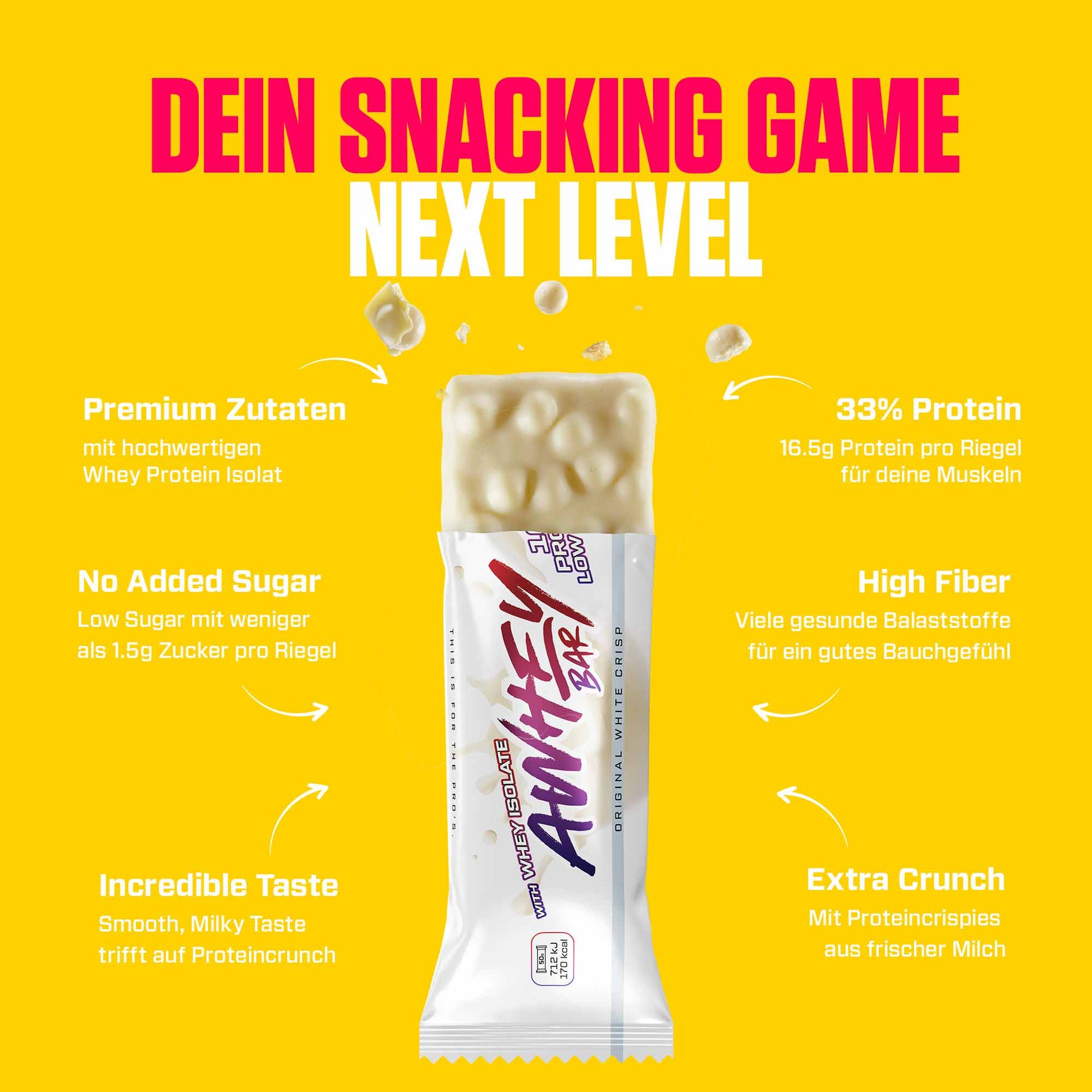 Leistungsstarke 33% Protein aus reinstem Whey-Isolat und Caseinprotein, kombiniert mit knusprigen Milch-Proteincrispies, liefert sie dir einen unwiderstehlichen Mix aus Geschmack und Crunch – und dazu einen effektiven Proteinboost für deine Muskeln.