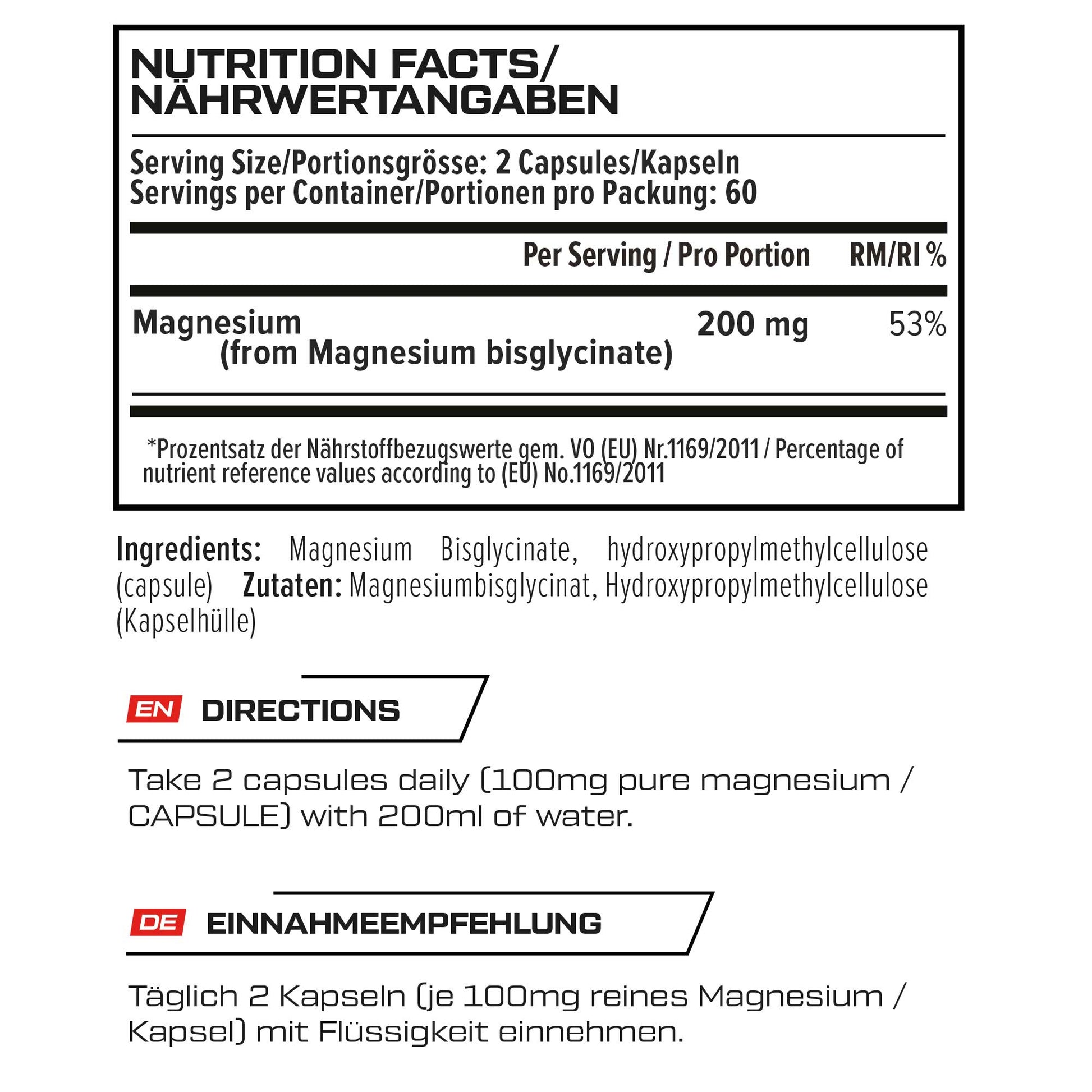| Magnesium (als Magnesium bisglycinat) | 200 mg | 53 % |