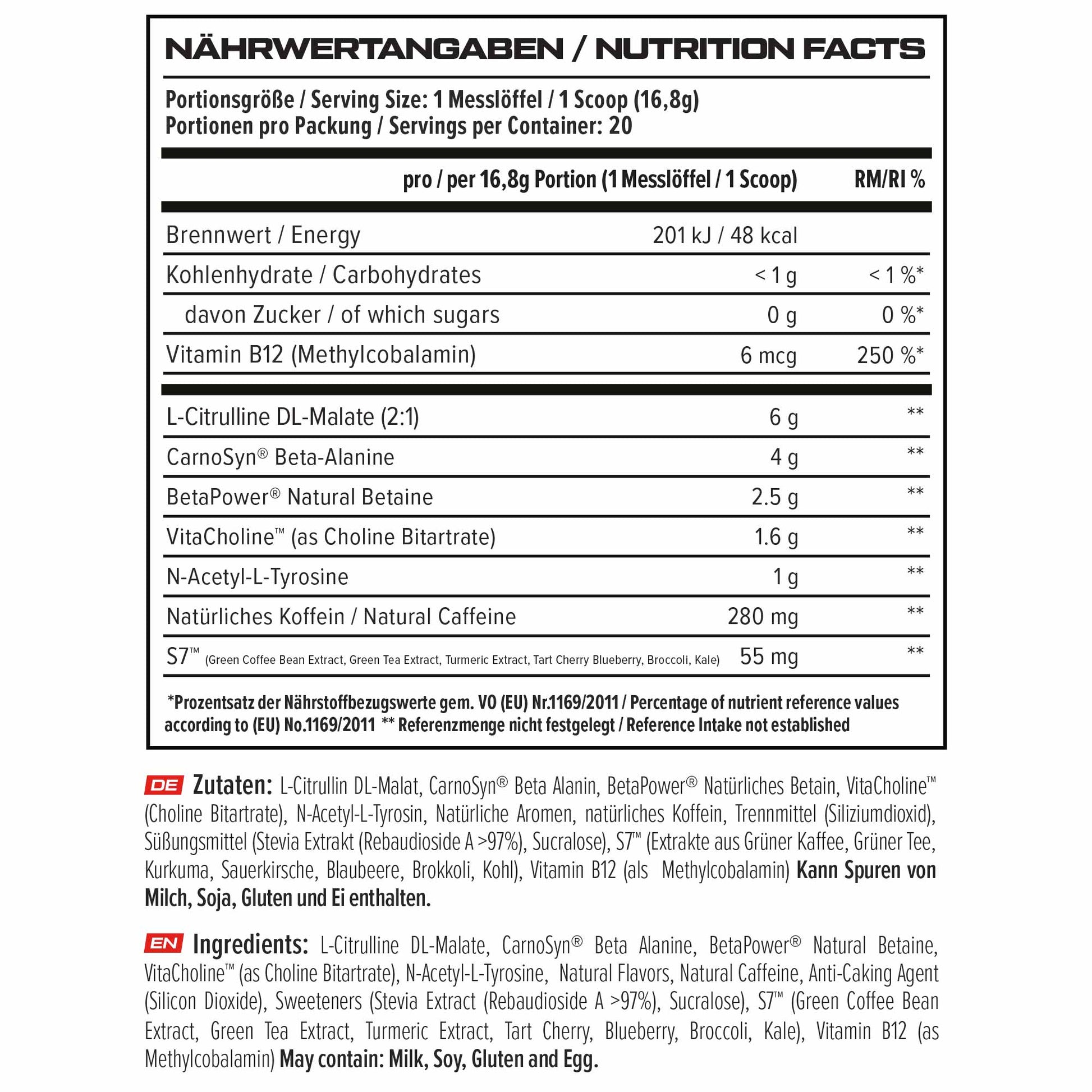 Zutaten: L-Citrullin DL-Malat, CarnoSyn® Beta Alanin, BetaPower® Natürliches Betain, N-Acetyl-L-Tyrosin, Natürliche Aromen, VitaCholine® (als Cholin Bitartrat), Natürliches Koffein, S7™ (Extrakte aus Grüner Kaffee, Grüner Tee, Kurkuma, Sauerkirsche, Blaubeere, Brokkoli, Kohl), Farbstoff (Rote Beete Extrakt), Trennmittel (Calciumsilikat), Süßungsmittel (Stevia Extrakt (Rebaudioside A >97%), Sucralose), Vitamin B12 (Methylcobalamin). Kann Spuren von Milch, Soja, Gluten und Ei enthalten.